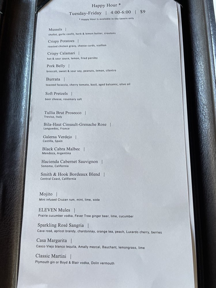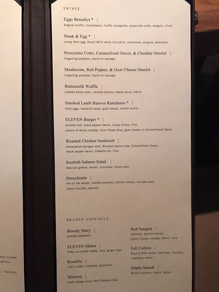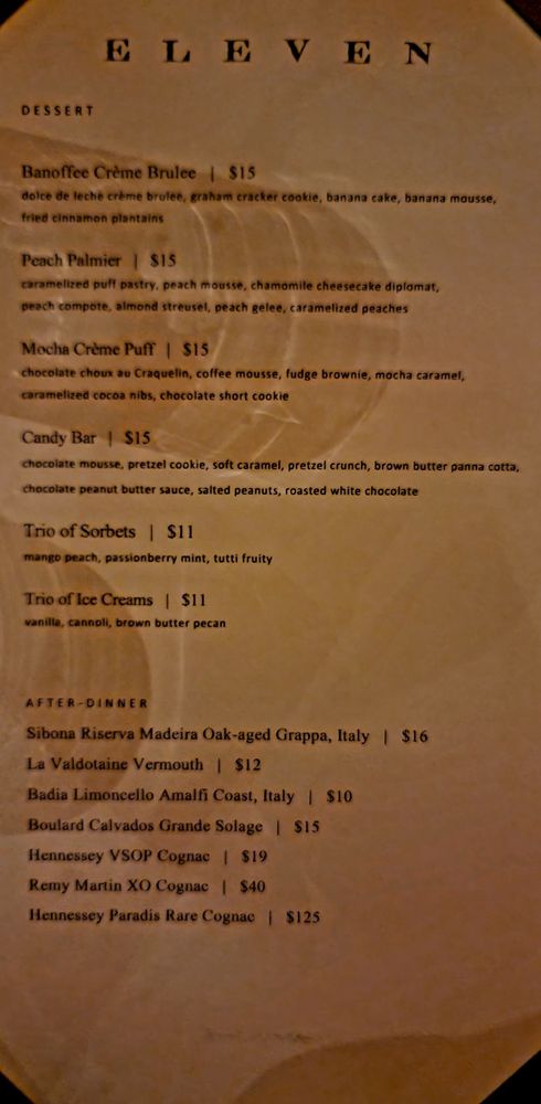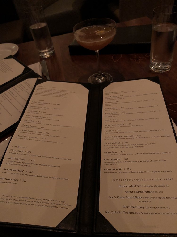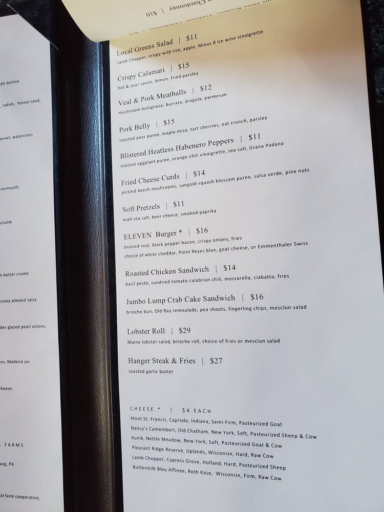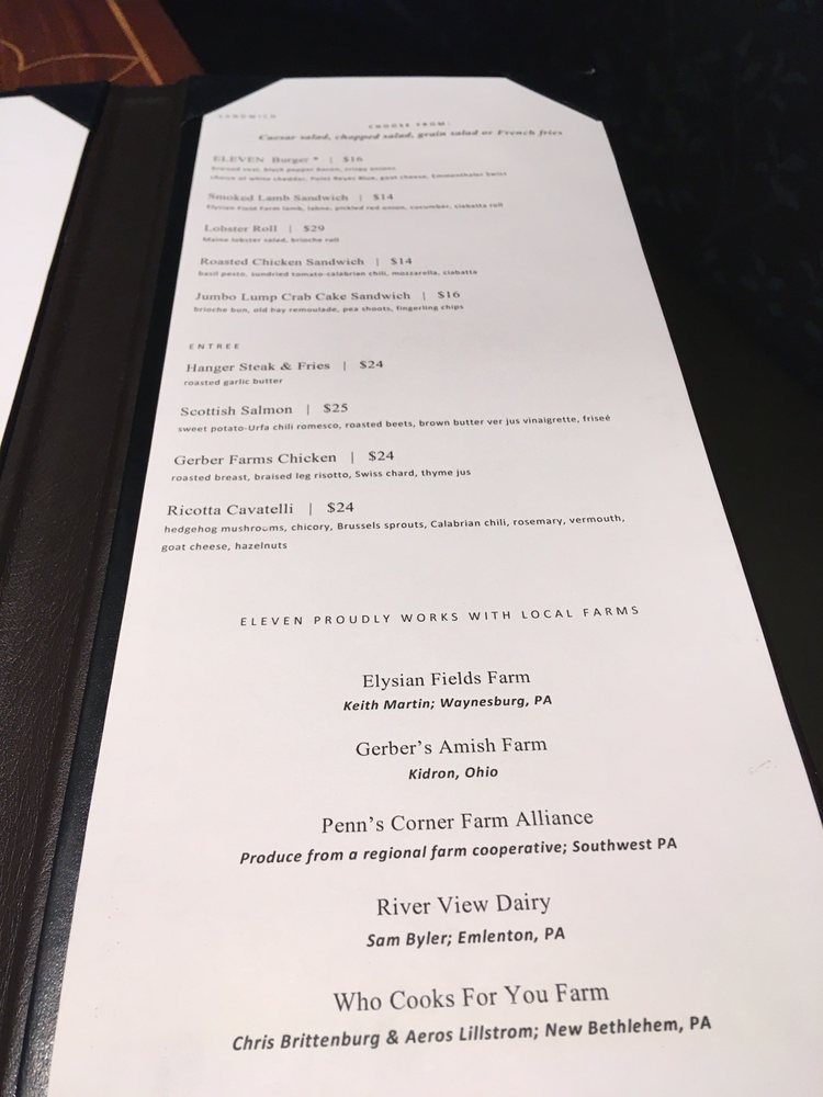 "Introducing the menu at Eleven, a New American restaurant located in Pittsburgh's Strip District, known for its seasonal offerings and outstanding wine list. Chef Eli Wahl's mastery of seasonal ingredients shines through dishes like the Seafood Tasting, featuring striped bass and crab cake. Customers rave about the ambiance, attentive staff, and creative menu items like the golden beet salad with peaches and the delectable peach mousse dessert. The upscale setting offers outdoor seating, a full bar, and happy hour specials. With options for pescatarians, vegans, and limited vegetarians, Eleven provides a dining experience that caters to a variety of dietary preferences. If you're looking for a memorable dining experience in Pittsburgh, Eleven is a must-visit destination."